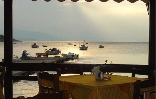 Just underneath the rooms of the Romvi Hotel, on a large terrace, overlooking the sea, sits the Romvi Taverna, open from early morning to late at night. Breakfast, which is included in the price of the rooms, is served here and frankly there is no better way to start the day with the wonderful view of the islands in the bay. The restaurant is very popular with Greeks and tourists alike, serving excellent home-cooked food a mixture of traditional Greek cuisine and more modern dishes, something for everyone's tastes. The tables are situated both on the terrace and on the beach, great for during the day if you would like to combine a lunch with swimming or sunbathing. Evenings at the Romvi Taverna are the perfect surroundings for an evening to titillate all the senses at once, especially if one chooses the beach tables, the candlelight emphasising the view and making the atmosphere that much more romantic. |